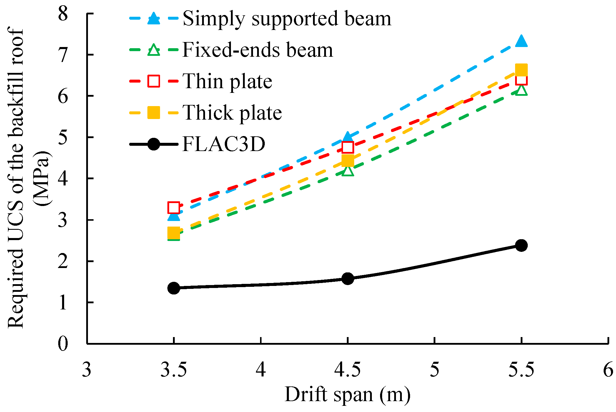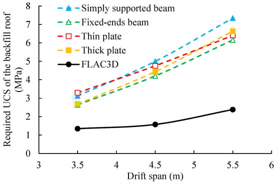 Variations in the required UCS of the backfill roof with different drift spans, obtained by numerical simulation and analytical solutions (Equations (3)–(6)), respectively.