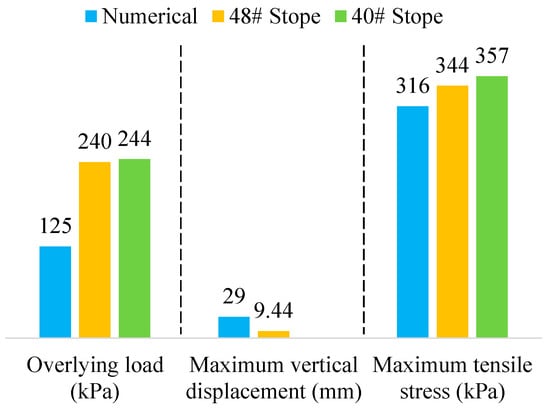 We attempted to validate the numerical simulations by comparing the numerical results with field data obtained from a published study by Hu et al., who conducted field measurements on the overlying load and stress state of the cemented paste backfill roof at the Jinchuan Nickel Mine using underhand drift-and-fill mining [32]. Strain gauges and pressure sensors were installed in the backfill roof at 48# and 40# Stopes to collect the stress and strain data, and further details about the measurement can be found in Hu’s study [32]. The measured overlying load, maximum vertical displacement, and maximum tensile stress of the backfill roof were compared with those obtained from the numerical simulation for the case with drift sizes of 3.5 m × 3.0 m, as shown in Figure 8.