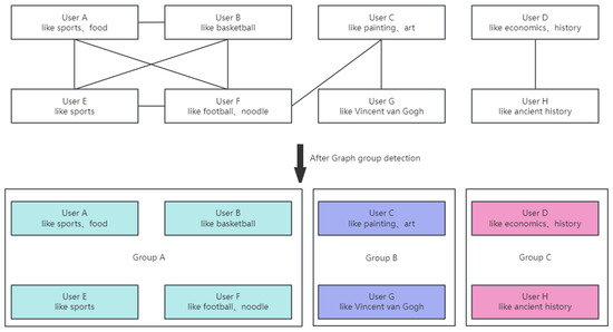 Before learning the meta-learning algorithm, we use the above graph community detection algorithm for clustering the users and represent the relationship between users as a graph; this relationship can be follow each other, like each other, like the same content, and so on, in order to find the users who have a close relationship. The comparison of the graph community detection algorithm before and after is shown in Figure 3.