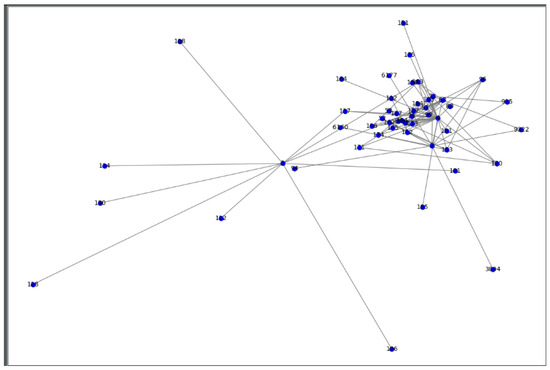 where L denotes the number of edges contained in the graph, N denotes the number of vertices, the value of denotes the number of edges between vertex i and vertex j, denotes the expected value of the number of edges between node i and node j if the edges are placed randomly, where and denote the degree of each vertex, that is, how many vertices are connected to it, and lastly, Kronecker’s delta function, where two parameters return 1 if they are equal or 0 if they are not. In Equation (3), if the vertices belong to the same cluster, then it returns 1, and 0 otherwise.