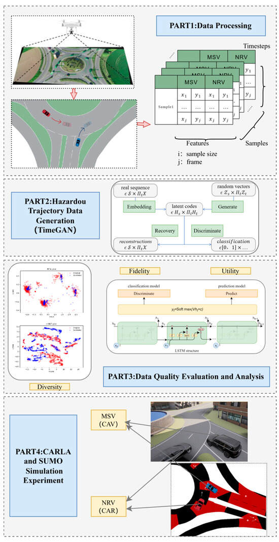 The research framework of this study consists of four main parts, as shown in Figure 1: (1) Data processing, which introduces the extraction of merging scenarios from the RounD dataset and the preprocessing of raw data to obtain basic information on interacting vehicle pairs and hazardous scenarios. (2) Data generation: this part describes the structure of the TimeGAN model and the method of data generation. (3) Data evaluation: the generated data are evaluated from three perspectives, and their respective metrics are proposed in this section. (4) Simulation testing: the last section utilizes the Simulation of Urban Mobility (SUMO) and CARLA platforms to establish a simulation scenario of a roundabout and tests the generated hazardous scenarios to verify the effectiveness of the dangerous trajectories.