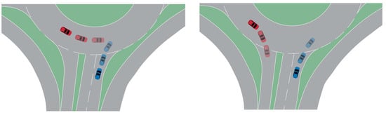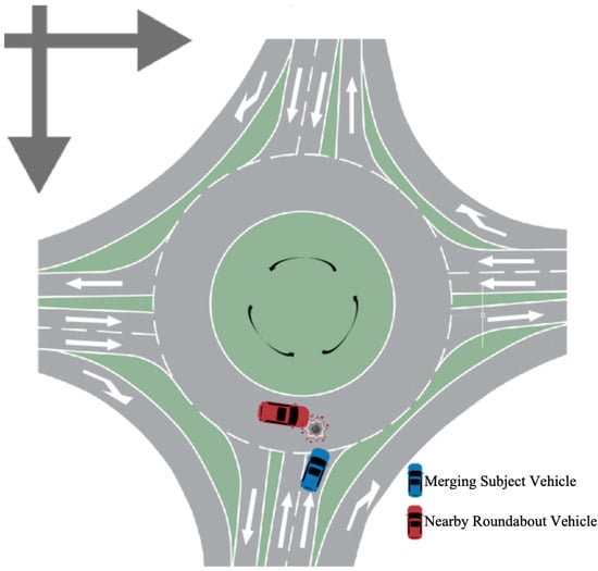 Compared to conventional intersections, roundabouts have the advantage of reducing the frequency and severity of traffic crashes, as well as contributing to the efficiency of road traffic []. However, when navigating a multi-lane roundabout, cars must switch lanes several times as they enter and depart the traffic circle. This results in multi-lane changes having more conflict points than single-lane changes, increasing the likelihood of collisions [].