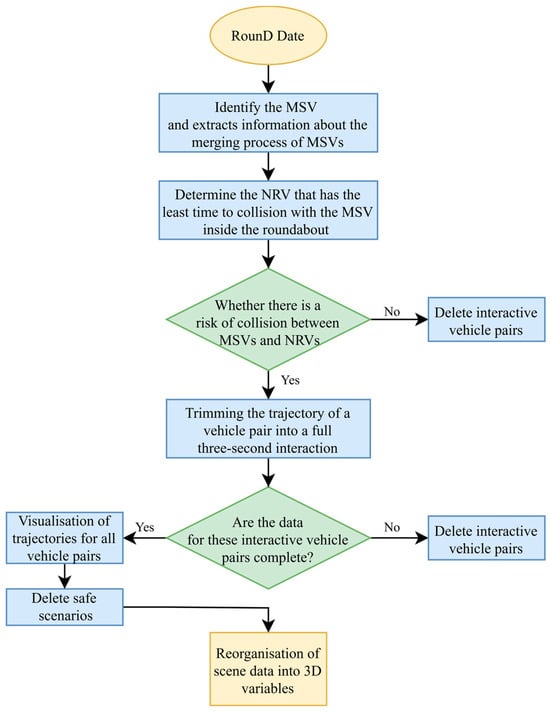 The roundabout merging critical hazard scenario was combined with the fundamental information of the interacting vehicle pair and 3 s of trajectory data, resulting in a complete, continuous, and uninterrupted trajectory data of the two vehicles. The details of the data processing and extraction are depicted in Figure 4. The first step involved identifying the MSV, which is the vehicle attempting to merge into the roundabout. Detailed information about the merging process of the MSVs was extracted. This included data on speed, acceleration, steering angles, and other relevant parameters. Next, the system identified the NRV that has the least time to collision with the MSV inside the roundabout. The workflow then evaluated whether there is a risk of collision between the MSVs and CVs. If no risk was detected, the interactive vehicle pairs were deleted from further analysis. For vehicle pairs identified as having a collision risk, the trajectories were trimmed to include only a full three-second interaction. This trimming ensured that the data analyzed focused on the critical moments leading up to potential collisions, providing a detailed view of the interaction dynamics. After trimming, the system checked if the data for these interactive vehicle pairs were complete. Incomplete datasets were deleted to maintain the quality and reliability of the analysis. If the datasets were complete, the trajectories for all vehicle pairs were visualized. Following this, safe scenarios were deleted, further refining the dataset to include only those scenarios that were critical for safety analysis. The final step involved reorganizing the scene data into 3D variables. More detailed criteria and content are described below.
