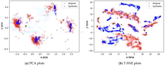 Three aspects must be considered in order to assess the quality of generated data: diversity, similarity, and authenticity of the generated samples. The degree to which the distribution of created samples covers the distribution of actual data is referred to as diversity. A common and effective method for evaluating this measure is visualization and dimensionality reduction. In this investigation, principal component analysis (PCA) and t-distributed stochastic neighbor embedding (t-SNE) were employed to scrutinize both the pristine dataset and the synthesized counterpart, whereby temporal information was flattened to project three-dimensional data onto a two-dimensional coordinate plane. This approach facilitated the visual appraisal of the similarity between the distribution of generated samples and that of the original samples.