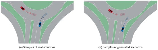 At present, testing scenarios can be classified into typical scenarios and edge scenarios according to the requirements. Typical scenarios are generally used for routine functional testing of autonomous driving systems, typically selected from real traffic data as representative test cases, but they cannot cover all real-world conditions. For testing autonomous vehicles, it is crucial not only to focus on the safety of various vehicle functions in normal driving scenarios, but also to emphasize the vehicle’s ability to safely navigate challenging testing scenarios. Selecting high-risk scenarios from numerous complex traffic situations has become a focal point [,]. Thus, edge scenarios complement typical scenarios and are described as low-probability event scenarios that are difficult to handle, lying between the boundaries of danger and safety. At the same time, autonomous driving scenarios exhibit high levels of uncertainty, with a complexity that is difficult to exhaustively cover. To enhance scenario coverage, it is necessary to evolve new derivative scenarios from real traffic data. Currently, methods for generating such critical scenarios include optimization search-based generation [,,], reinforcement learning-based generation [,,], importance sampling-based generation [,,], and deep-learning-based generation [,,]. However, whether the characteristics of derived scenarios are consistent with real traffic data remains unknown. It is possible to generate scenarios that do not exist in the real world, so derived scenarios need to be validated for authenticity before use.