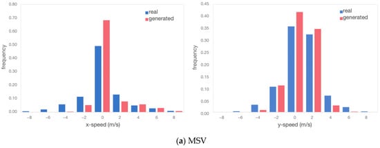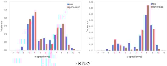 For the MSV, as it is a merging vehicle, it tended to slow down and observe before entering the roundabout, resulting in speeds predominantly concentrated between [−5, 5] m/s. On the other hand, the NRV maintained a steady speed while navigating the roundabout. Although it did not decelerate to yield, its speed during roundabout traversal remained relatively slow, with speeds concentrated in the range [2, 8] m/s regardless of the vehicle’s position. These similarities in the distribution of speeds indicate that the TimeGAN model effectively captured the motion characteristics of both the MSV and NRV. Although there may be slight differences in mathematical features, such as maximum/minimum values, as shown in Table 2, these differences were within expectations and consistent with real-world scenarios.