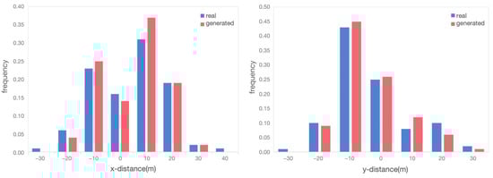 Distance distributions: Figure 14 illustrates the distances between interacting vehicle pairs in the horizontal and vertical directions. The overall distribution patterns of generated and real-world scenario data were consistent. The distances in both directions were mainly concentrated in the range of [−20, 20] m. This consistency was due to the structural characteristics of the roundabout. The horizontal direction of the north–south entrance and the vertical direction of the east–west entrance showed the distance characteristics in the same directions for the interacting vehicles. When paired with the information in Table 2, it was evident that the range of distance distribution was more concentrated in the generated scenario. This trend was also reflected in the distribution of MTTC values, as shown in Figure 15.