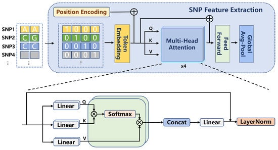In this study, the extraction of SNP features was performed using a Transformer-based network. First, the SNP data underwent pre-screening using the GWAS approach, retaining SNP loci with p-values smaller than . The selected SNP data were then converted into 4D one-hot encoded vectors with a format of , where B represents the batch size, 434 corresponds to the number of filtered SNP loci, and 4 indicates the four possible allele states at each locus. The input SNP features were subsequently processed through a one-dimensional convolutional layer, generating embedded representations (embeddings). This convolutional layer, utilizing a sliding window approach, processed the input data, enabling the network to capture local patterns within the SNP features. The output from the convolutional layer was then fed into a positional encoding and multi-head attention mechanism module for further processing. The process is shown in Formula (1).