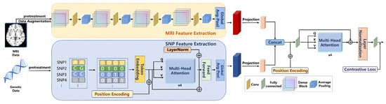 Feature Alignment: In the initial stage, the features from SNP and MRI data are aligned through linear projection. Since the feature dimensions of SNP data and MRI images differ, a linear transformation is applied to map them into a unified feature space. This ensures that the features from both modalities can be fused at the same level. This process can be expressed mathematically as shown in Formula (3).