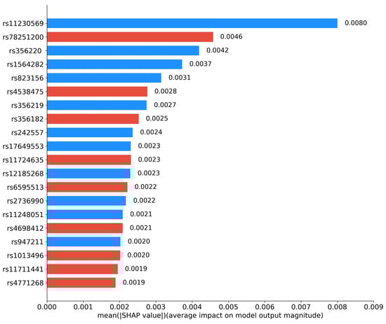 We further investigated the interpretability of RACF in PD diagnosis. By utilizing Grad-CAM, we visualized the key brain regions in sMRI images that drive the predictions of the model. Figure 5 highlights these critical regions, with the model primarily focusing on the basal ganglia and substantia nigra, particularly the caudate nucleus and globus pallidus within the basal ganglia. Figure 6 presents the SHAP value analysis, identifying the top 20 SNPs that contribute the most to the classification decision. In the figure, blue represents SNPs that have been reported in existing studies, while red indicates SNPs predicted as risk loci by our method. Among the top 20 SNPs ranked by SHAP values, rs11230569, rs356220, rs1564282, rs823156, rs356219, rs242557, rs17649553, rs12185268, rs2736990, rs11248051, and rs947211 are all known PD-related loci reported in the literature. rs78251200, rs4538475, rs356228, rs11724635, rs6595513, rs4698412, rs1013496, rs11711441, and rs4771268 are potential risk loci predicted by the RACF model.