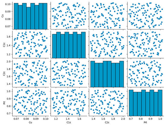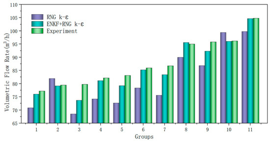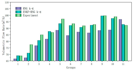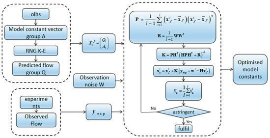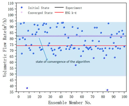 In this study, 100 samples, corresponding to the total number of ensemble members (L = 100), are generated through Latin hypercube sampling and selected for calibrating the turbulence model constants. The predicted flow rates for these 100 samples under specific operating conditions are obtained using RNG k-ε model calculations. According to the integration method in Equation (17), these 100 sets of predicted flow rates serve as the initial state matrix for the algorithm. Subsequently, the initial state matrix is updated through several iterations of the ensemble Kalman filtering algorithm, using experimentally observed flow data to derive the optimal model constants calibrated through data assimilation. Finally, the newly calibrated model constants are applied under various operating conditions to evaluate their reliability and applicability. The entire process is illustrated in Figure 1.