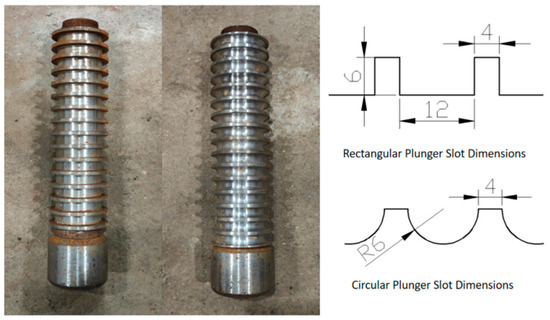 According to the optimal diameter ratio proposed by Zhao et al. [22], the outer diameter of the plunger was set to 57.6 mm. Based on the findings of Wang et al. [23], the rectangular slot, which exhibits the poorest sealing performance, and the arc-shaped slot, which demonstrates the best sealing performance, were selected as the sealing slot structures for the plunger’s exterior. The rectangular slot has a depth of 6 mm and a width of 12 mm, while the arc-shaped slot has a radius of 6 mm and is designed as a complete semicircle. The experimental plunger device, as illustrated in Figure 3, is constructed from stainless steel, with each plunger weighing 3.5 kg.