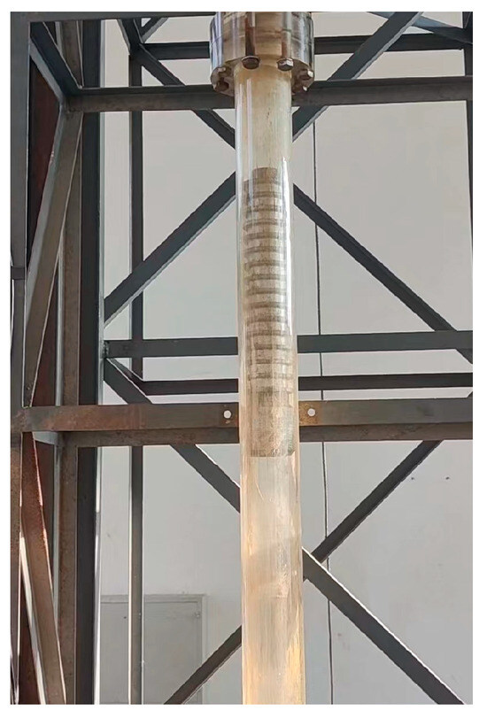 - The intake valve is opened, and the gas flow rate is gradually increased until the plunger begins to exhibit signs of activation. By precisely controlling the gas flow, the plunger is brought to a state of upward motion. The flow rate is then finely adjusted so that the plunger reaches and maintains a stable hovering position, as illustrated in Figure 4. Once in position, the plunger is held in suspension for 10 s, during which the inlet flow rate, inlet pressure, bottom-hole pressure, and wellhead pressure are recorded. Data are collected at a sampling frequency of one measurement per second, and the average values during this steady-state period are subsequently calculated.