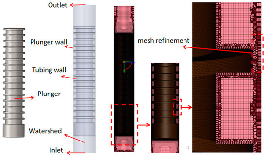 Due to the irregular rod-like external structure of the plunger, the fluid dynamics around it become highly complex. This complexity stems not only from the plunger’s geometry but also from the fluid flow behavior both around and within the plunger. To effectively simulate and analyze this intricate flow scenario, the RNG k-ε model, an enhanced version of the standard k-ε model, provides an ideal solution. By incorporating additional correction terms, this model can accurately handle strong vortex flows and flow distortions around curved surfaces, thereby improving the precision of turbulence simulations. The RNG k-ε model excels in simulating flow fields both inside and outside the plunger, effectively capturing subtle flow variations and vortex structures [17].