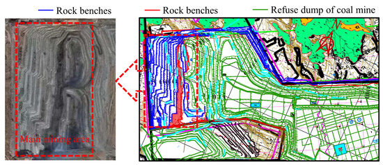 The blasting scheme was as follows: weak cast blasting was applied to the rock bench, while loosening blasting was applied to the coal bench. The charge structures were coupling and axial decoupling, respectively. The blast area was designed with four rows of blast holes. The hole pattern parameters were 6.0 × 4.5 m, and the total hole length was approximately 21.3 m, with no over-drilling. The initiation method was micro-delay sequential hole initiation, with a delay time of 65 ms between rows of boreholes and 42 ms between boreholes. The explosive used was an emulsion explosive with a density of 1.1 kg/m3 and a detonation velocity of approximately 4200 m/s. The detonator was a digital electronic detonator. The location of the blasting test is shown in Figure 17, and specific blasting parameters are listed in Table 8.
