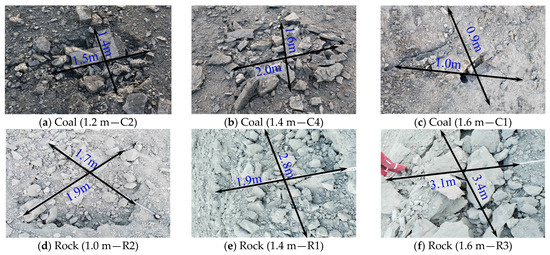 After the blast, the boundaries of the blast crater are defined, debris inside the crater is cleared, and the crater diameter is measured from different directions (spaced 45° apart), along with depth measurements of the crater. The typical fragmentation morphology of the coal and rock blast crater test results (partial) is illustrated in Figure 4.
