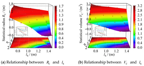 The statistical results in Table 3 were utilized to analyze the geometric parameters of the blast craters formed under six different length-to-diameter ratio charge conditions for coal and rock. The relationships between crater statistical radius and crater volume statistical radius and fill height are illustrated in Figure 5 and Figure 6.