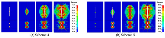 Based on the numerical model with different charge structures, the damage contour maps of coal and rock fragmentation under different charge structures were extracted and analyzed for damage characteristics, as shown in Figure 16.