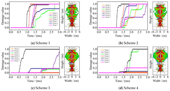 Scheme S-2 (Figure 16b), compared to Scheme S-1, demonstrates that the increase in stemming length results in a longer duration of the stress wave within the rock mass, which is fully utilized internally. This causes the intensity of the stress wave reaching the stratification interface to decrease, resulting in weakened damage to the rock at the interface; however, the damage degree remains relatively sufficient. The degree of damage to the bench on the free face is consistent with Scheme S-1.