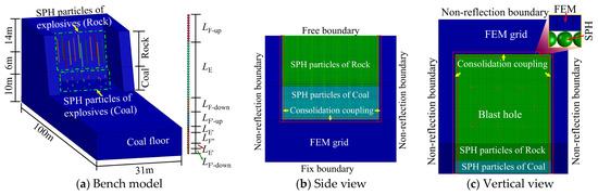 Non-reflective boundary conditions are applied to the bottom and lateral surfaces of the model to minimize the impact of stress wave reflection at the model boundaries on the calculation results. Gravitational acceleration is applied in the vertical direction, and a fixed-end constraint is imposed at the model’s bottom. The ALE algorithm is employed between coal, rock, and explosives to avoid mesh distortion in the Lagrangian grid during large deformation analysis, which can lead to computational inaccuracy.