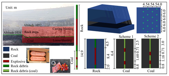 Cast blasting is crucial in enhancing stripping efficiency [1,2,3] and reducing production costs [4,5,6]. During the open-pit mining process, due to the layout of the mining system and the spatiotemporal coordination of stripping operations, thin coal seams are often blasted together with rock and discarded as waste, resulting in significant coal resource loss. Experimental studies on optimizing the explosive charge structure for coal–rock mixed blasting under deep-hole bench conditions have been conducted to improve the recovery rate of thin coal seams and enhance coal resource extraction efficiency. They propose a rational charge structure to facilitate the mixed blasting of coal and rock, achieving selective mining. Advancing the development of deep-hole bench coal–rock mixed blasting selective mining technology is of substantial practical importance for enabling economic, efficient, and environmentally friendly mining.