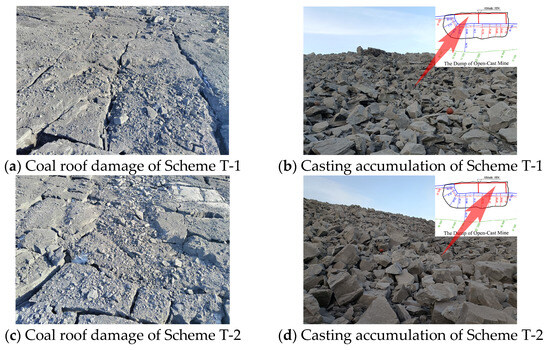 Figure 18 illustrates the field mixed blasting test results. Figure 18a,b represent the casting effect after blasting with Scheme T-1 and the damage to the coal seam roof exposed after clearing the rock layer. Figure 18c,d depict the blasting results of Scheme T-2.