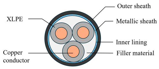 Low-voltage cables are primarily composed of three components: the conductor, the insulation layer, and the outer sheath. To enhance the cable’s resistance to pressure, armored cables, which have a metal sheath placed between the insulation layer and the outer sheath, are also commonly used. Depending on the application requirements, cables can be categorized into types such as single-core, double-core, and three-core cables, etc. The cross-sectional structure of a three-core low-voltage XLPE cable is illustrated in Figure 1.