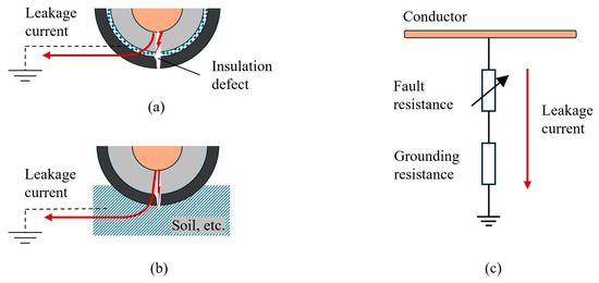 Leakage current (a) through the cable metal layer or (b) directly through the surrounding dielectric medium; (c) equivalent circuit diagram.