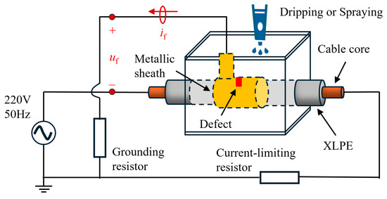 - Liquid penetration condition: saltwater is added dropwise at a rate of 1 drop per 10 s around the defect to simulate the slow penetration of liquid into the cable’s insulation defect. This is to mimic the situation in which the cable is surrounded by shallow water, such as rainwater.