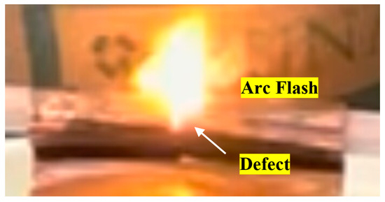 The typical results are presented as follows. In the experiment, saline with a conductivity of 3 mS/cm was used, and the grounding resistance was set to 30 Ω. During the experimental process, first, the discharge arc can be observed occasionally. As the discharge process was going on, the insulation defect expanded due to erosion, allowing more liquid to gradually penetrate the defect. Figure 5 illustrates the change in the size of an insulation defect in a sample cable, increasing from the initially set 1.1 mm to 2.4 mm. Intermittent, distinct arc flashes were clearly observed at the insulation defect, accompanied by sharp sounds resulting from the rapid expansion of gas, as well as small amounts of liquid ejected from the defect. The arc generation phenomenon is shown in Figure 6.