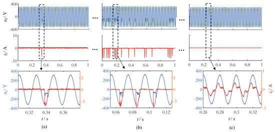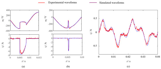 Comparison of experimental and simulated waveforms: (a) sub-cycle arc waveform in liquid penetration or immersion condition; (b) sub-cycle arc waveform in humid air exposure condition; (c) periodic current waveform in liquid penetration or immersion condition.