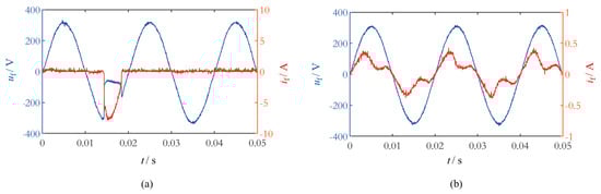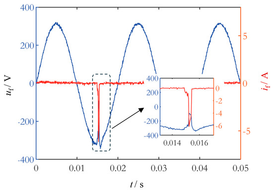 The defective cable was fully immersed in liquid with a conductivity of 3 mS/cm and a defect width of 1.2 mm. The grounding resistance was 30 Ω. Under these conditions, typically no more than five intermittent arcs were observed before transitioning rapidly into a sustained periodic leakage current phase. Figure 9 presents the sub-cycle arc waveform and periodic current waveform obtained under immersion conditions, which exhibit the same characteristics as those observed under liquid penetration conditions. Compared to the gradual penetration of liquid into insulation defects, immersing defective cable in water allows the liquid to fill the defect more rapidly, leading to a quicker transition into a sustained current leakage status.