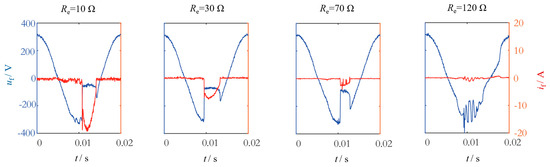 As shown in Figure 10, for the first two stages of 3.1 and the first stage of 3.3, sub-cycle arc waveforms were recorded under different grounding resistances, with a cable defect width of 1.5 mm. The arcs were generated under liquid penetration conditions, with a liquid conductivity of 3 mS/cm and grounding resistances set to 10 Ω, 30 Ω, 70 Ω, and 120 Ω. The experimental results indicate that as the grounding resistance increases from 10 Ω to 30 Ω, the arc current gradually decreases due to the current-limiting effect of the resistance. The current amplitude reduces from 19 A to 8 A, while the arc voltage and current maintain smooth variations, suggesting that the arc remains relatively stable during combustion. At a grounding resistance of 70 Ω, the voltage and current waveforms exhibit high-frequency components, indicating an unstable arc. When the grounding resistance reaches 120 Ω, voltage and current waveforms show more pronounced fluctuations, with the current amplitude remaining low, peaking at approximately 1 A. This suggests that high grounding resistance significantly suppresses the discharge process, making it difficult for the arc current to form a stable flow. Since arc generation requires sufficient current to sustain ionization in the defect, the entire process remains weak and unstable. Additionally, the number of observed arc occurrences is significantly reduced.
