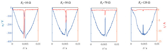 As shown in Figure 11, for humid air exposure conditions (3.2), sub-cycle arc waveforms were recorded under different grounding resistances, with a cable defect width of 1.2 mm. The arcs were generated in humid air conditions with a relative humidity of 85% and a liquid conductivity of 3 mS/cm. Compared to the variation pattern of the arc in liquid penetration conditions, the common characteristic between the two is that their amplitudes decrease as the grounding resistance increases. However, due to the extremely short duration of transient arcs, the increase in grounding resistance does not significantly affect the waveform shape, and the current consistently maintains a pulse-like form.