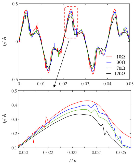 As shown in Figure 12, for the third stage of 3.1 and the second stage of 3.3, periodic current waveforms were recorded under different grounding resistances, with an insulation defect width of 2.2 mm. The cable was fully immersed in water with a conductivity of 3 mS/cm. Unlike arc discharge conditions, where the arc state is significantly affected by current amplitude, in this case, the liquid within the insulation defect behaves as a persistent nonlinear resistor. The series-connected grounding resistance only influences the current amplitude without significantly altering the waveform shape. The calculations indicate that the minimum fault resistance formed by the liquid in the insulation defect is approximately 700 Ω. Consequently, as the grounding resistance increases from 10 Ω to 120 Ω, the peak current decreases by only a few milliamps.