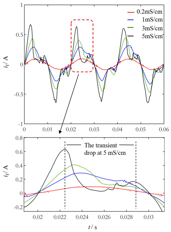 Periodic current waveforms under different liquid conductivities in the 3rd stage of liquid penetration and the 2nd stage of liquid immersion conditions.