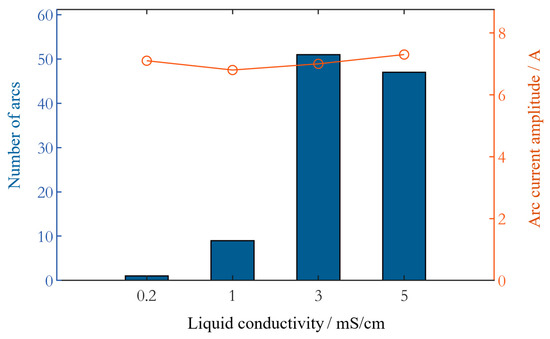 Figure 14 presents the statistical results of intermittent arc occurrences over one hour under different liquid conductivities. The cable defect width is 1.8 mm, and arcs are generated under water penetration conditions with a grounding resistance of 30 Ω. When the liquid conductivity is below 0.2 mS/cm, intermittent arcs are rarely observed. As the conductivity increases to 3 mS/cm, the number of arcs rises significantly, reaching approximately 50. However, when the conductivity further increases to 5 mS/cm, the number of arcs remains the same as that at 3 mS/cm. Despite the increase in liquid conductivity, no significant change is observed in the magnitude of arc current, which remains in the range of 6–8 A, nor is there any noticeable change in current shape. These results indicate that liquid conductivity primarily affects arc generation but has little influence on arc current magnitude.