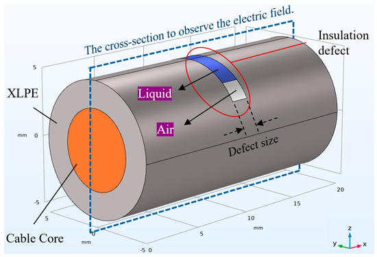 To simulate the electric field distribution within the insulation defect, the COMSOL Multiphysics 6.2 simulation software was used for modeling and analysis. Since the insulation defect region is the primary discharge area, a segment of the cable near the defect was selected for simulation, as shown in Figure 15. The main components of the simulation model are the cable conductor and the XLPE insulation layer. A through-defect penetrating the insulation layer is placed at the center of the model, with a variable size. The defect region is divided into two parts: the upper part is filled with water, and the lower part with air. The thicknesses of the water and air layers are adjustable to simulate the gradual intrusion of water into the defect. Since breakdown typically occurs near the voltage peak, where the electric field strength is at its maximum, the analysis can be simplified to focus on the electric field distribution at the voltage peak under electrostatic conditions. The relative permittivity of air is set to 1, that of the liquid to 80, and that of XLPE to 2.2, with a thickness of 2 mm. The cable core material is copper, modeled as an equipotential body with a potential of 318 V, while the liquid layer is set to a ground potential.