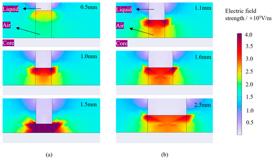 As the liquid gradually penetrates the insulation defect, the thickness of the water layer increases while the thickness of the air layer decreases. The electric field distributions corresponding to different water layer thicknesses within the defect are shown in Figure 16a, with the defect width fixed at 1.1 mm. As the water layer becomes thicker, the electric field distribution changes significantly. When the water layer thickness reaches 0.5 mm, the electric field shows a certain degree of concentration at the interface between the water and air layers. However, the overall field strength remains relatively low, around 2.5 kV/cm, with the field near the conductor core at approximately 1.5 kV/cm. As the water layer thickness increases to 1.0 mm, the concentration of the electric field at the interface becomes more pronounced, forming a localized high-field region where the maximum electric field strength at the interface reaches 4–5 kV/cm. When the water layer thickness further increases to 1.5 mm, the electric field strength around the entire air column reaches 4–5 kV/cm. In highly non-uniform electric fields, the breakdown strength of air is approximately 3–10 kV/cm, which can lead to electrical breakdown and the formation of an arc within the defect.