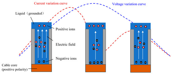 During half a cycle, as the voltage gradually increases, the electric field strength near the surface of the cable core (under positive polarity) intensifies. At this stage, negative ions in the liquid migrate toward the surface of the cable core under the influence of the electric field, while positive ions move toward the grounded liquid end. The higher the ion concentration, the greater the number of ions migrating per unit time, resulting in a larger current. As the voltage approaches its peak, many ions rapidly accumulate on the metal surface of the cable core. These accumulated ions generate an electric field component opposite to the externally applied electric field, weakening the electric field within the defect and hindering further ion migration in the liquid, thereby reducing the current. A higher ion concentration leads to a greater accumulation of ions, producing a stronger opposing electric field, which causes the current to decrease more quickly and significantly. After the voltage surpasses its peak and begins to decrease, the ion accumulation rate slows, while the rate at which ions leave the cable core surface relatively increases. As a result, the number of accumulated ions on the electrode surface stops increasing and instead begins to decrease. With fewer accumulated ions, the strength of the opposing electric field generated by these ions gradually weakens. Under the remaining external electric field, the ions in the solution can gradually resume migration, leading to a renewed increase in current. The entire physical process is illustrated in Figure 17.