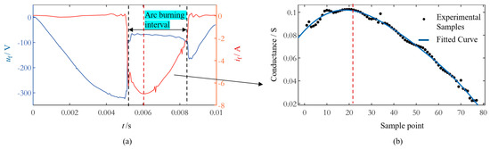 As shown in Figure 18, the typical sub-cycle arc voltage and current waveforms, arc conductance variation, and their corresponding relationships are presented. The arc interval is defined as the period between the instantaneous rise and fall of the voltage/current. The conductance value at each sampling moment within this interval is sequentially calculated. During arc initiation, an abrupt change occurs over a very short period of approximately 0.04–0.08 ms, as observed in the experimental waveforms. Considering that the entire arc duration is approximately 4 ms, this rapid transition is ignored in the model to focus on the subsequent conductance variation, which dominates the arc’s behavior. It can be observed that the conductance variation follows a trend similar to that of the arc current, exhibiting an initial increase followed by a decrease. The conductance reaches its maximum value at the current peak.
