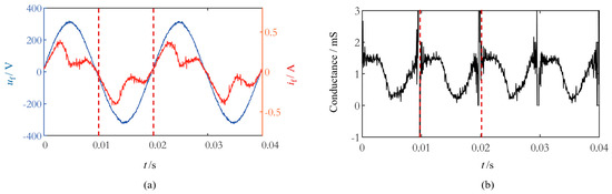 It can be observed that the variation of conductance exhibits a wave-like pattern, with similar maximum and minimum values in each cycle. Within half a cycle, conductance remains nearly constant for a short period after the voltage crosses zero, during which voltage and current rise synchronously. Around the voltage peak, conductance first decreases and then increases. To simulate the conductance variation within half a cycle, the conductance control function is divided into three segments: (1) conductance is set as a constant to represent its short-term invariance after the voltage crosses zero; (2) conductance decreases and then increases following a trigonometric function to model its variation near the voltage peak; (3) conductance remains constant again to simulate its short-term invariance after the final increase. Based on this conductance variation pattern and the piecewise modeling approach, the function describing conductance variation within half a cycle is constructed as follows:
