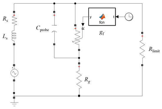 In Simulink, the experimental main circuit is constructed as an equivalent circuit, as shown in Figure 20. The power supply in this experiment provides an output voltage of 220 V at 50 Hz, with a maximum output capacity of 3 kVA. The equivalent resistance Rs of the power supply is set to 3.2 Ω, and the equivalent reactance Ls is 0.07 µH. The cables themselves contribute negligible resistance and reactance due to their short length, and their impedance is not explicitly modeled in this circuit. The current-limiting resistor Rlimit is set to 200 Ω, and the grounding resistor Rg is set to 30 Ω. The compensation capacitor of the medium-voltage probe Cprobe is set to 2.5 pF. A controllable nonlinear time-varying resistance module is used to represent the fault resistance, with its resistance value determined by the output of the fault conductance control function.