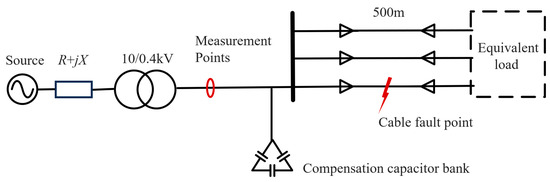 This section shows a cable incipient fault model application case. A low-voltage distribution system, as shown in Figure 22, is established in Simulink. The system parameters are as follows: The 10 kV system has an equivalent resistance of 0.05 Ω, an equivalent inductance of 1.58 mH, and a short-circuit capacity of 200 MVA. The transformer has a turn ratio of 10/0.4 kV and a capacity of 60 kVA. The system consists of three branch lines, each with a length of 0.5 km. The per-unit-length parameters are: resistance of 0.3 Ω/km, inductance of 0.08 mH/km, and capacitance of 0.2 μF/km. Each line carries a load of 10 kW, resulting in a total system equivalent load of 30 kW with a power factor of 0.88. A power factor compensation capacitor bank with a capacity of 5 kvar is employed, targeting a power factor of 0.93.