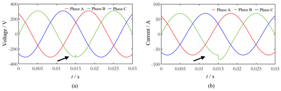 Measured waveform at the measurement point during the occurrence of a sub-cycle arc incipient fault: (a) voltage waveform; (b) current waveform.