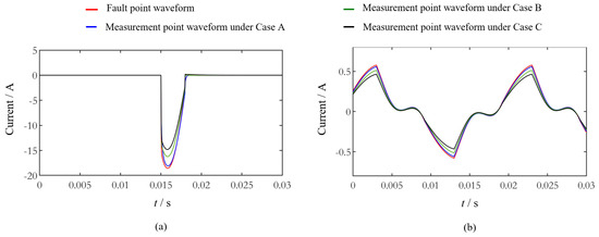 Comparison of extracted waveforms at different system parameters between measurement points and incipient fault points: (a) sub-cycle disturbances; (b) periodic disturbances.