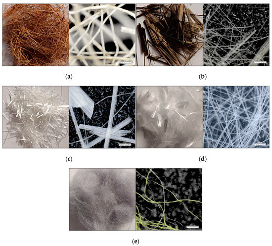 Representative view of (a) coconut (CO) fibers, (b) basalt (B) fibers, (c) glass (G) fibers, (d) polypropylene (PP) fibers, and (e) merino wool (M) fibers.