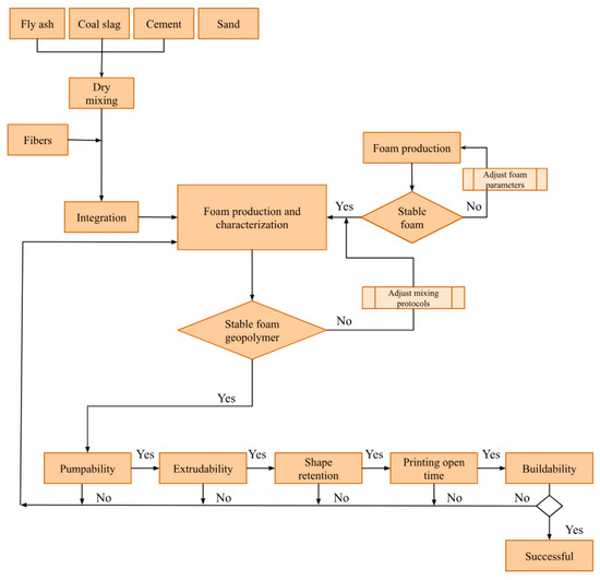 Procedure flow chart of a fiber-reinforced foamed concrete preparation for 3D printing applications [50].