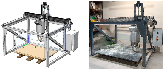Printability tests were conducted using the gantry-style 3D printer shown in Figure 3. The printer featured a print volume of 1000 mm (X-axis), 500 mm (Y-axis), and 500 mm (Z-axis), with a print head capable of achieving a maximum speed of 80 mm/s. The experimental setup incorporated a print head equipped with a 20 L hopper and a screw feeder with a length-to-diameter ratio of 3.5, ensuring consistent material flow during extrusion.