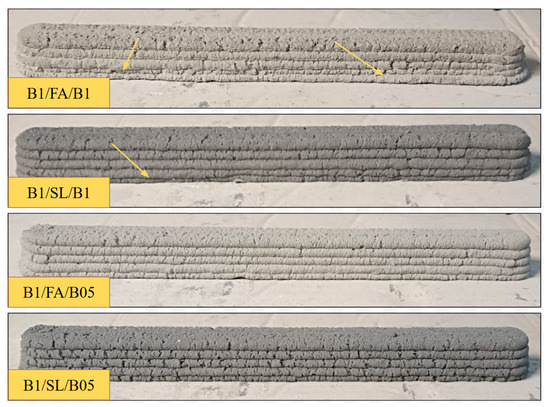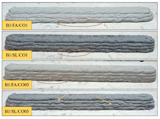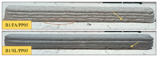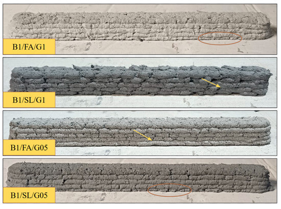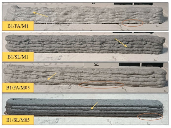 A portion of the prepared material was cast into molds, while the remaining portion was subjected to extrusion. All samples of fiber-reinforced foamed concrete were printed under standardized conditions, utilizing identical printing parameters. During the experiment, issues related to material blockage in the screw feeder were encountered, particularly in samples containing 1% by weight of fibers. This phenomenon has also been reported by other researchers [54]. To confirm the reproducibility of this issue, certain tests were repeated multiple times to assess whether screw and nozzle clogging persisted for specific mixtures. For mixtures containing 1% by weight of polypropylene fibers, the printing process proved to be unfeasible. Similarly, for the sample containing fly ash and 1% by weight of merino wool fibers, successful printing occurred only once, despite multiple attempts. In contrast, the extrusion of foamed concrete mixtures without fibers proceeded without incident, indicating a higher degree of stability in the absence of dispersed reinforcement. Mixtures without fibers exhibited higher flow properties, requiring a waiting period of 20 to 40 min before extrusion could commence, depending on the composition of the mixture. Figure 4, Figure 5, Figure 6, Figure 7, Figure 8 and Figure 9 provide a representative view of the printed material layers depending on their composition. Both during the printing process and after curing, it was evident that mixtures containing 1% fiber exhibited greater deformation compared to those with 0.5% fiber content. Notably, significant deformation was also observed in the lower layers across nearly all tests. Structural irregularities during layer deposition are indicated by arrows, while deformations in the lower layers are highlighted by circles. These observations are consistent with the results of previous experiments conducted by the authors [55,56].